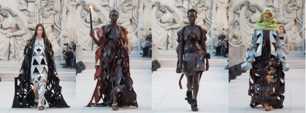 在加工精度高的激光切割技術協助下,幾何圖案切口光滑無毛邊,疊加后營造起豐富層次感。皮質長裙拼接打破了身體原有曲線,配合著火炬演出,將Rick Owens想表達的希望和恐懼的情緒推到高點。