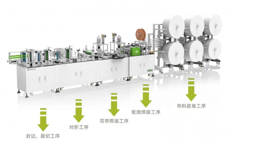 第三代HL-N95A全自動折疊口罩機主要由布料放卷工序、輪廓焊接工序、耳帶焊接工序、對折工序和封邊、裁切工序五個功能模塊部分組成。模塊化和人性化的設計,讓N95口罩生產和維護都十分便利。全機自動化、智能化程度高,1人可同時操控2~4臺車,可以大幅減少人力成本,具有技術先進、結構合理、運行可靠、操作方便、生產效率高等特點,可實現單機日產N95口罩5萬只以上。